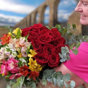BUQUÊ 12 ROSAS IMPORTADAS(FV), EUCALIPTO E12 ASTROMÉLIAS MISTAS