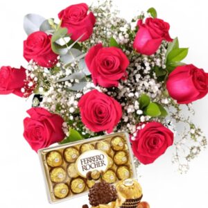 BUQUÊ COM 9 ROSAS IMPORTADAS (F) E 1 CAIXA FERRERO ACRÍLICO
