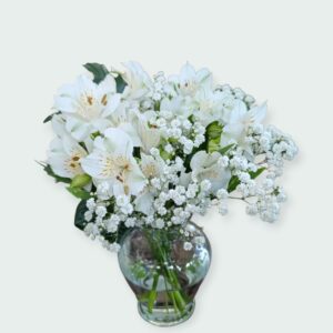 VIDRO TÓKIO COM 5 ASTROMÉLIAS BRANCAS E EGIPSIO