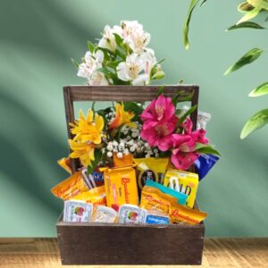 CESTA BOLSINHA COM PELÚCIA MIMO, ASTROMÉLIA,CANECA E FERRERO COM 4 UNIDADES