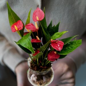 VASO PLANTADO DE MINI ANTURIO VERMELHO NO VIDRO