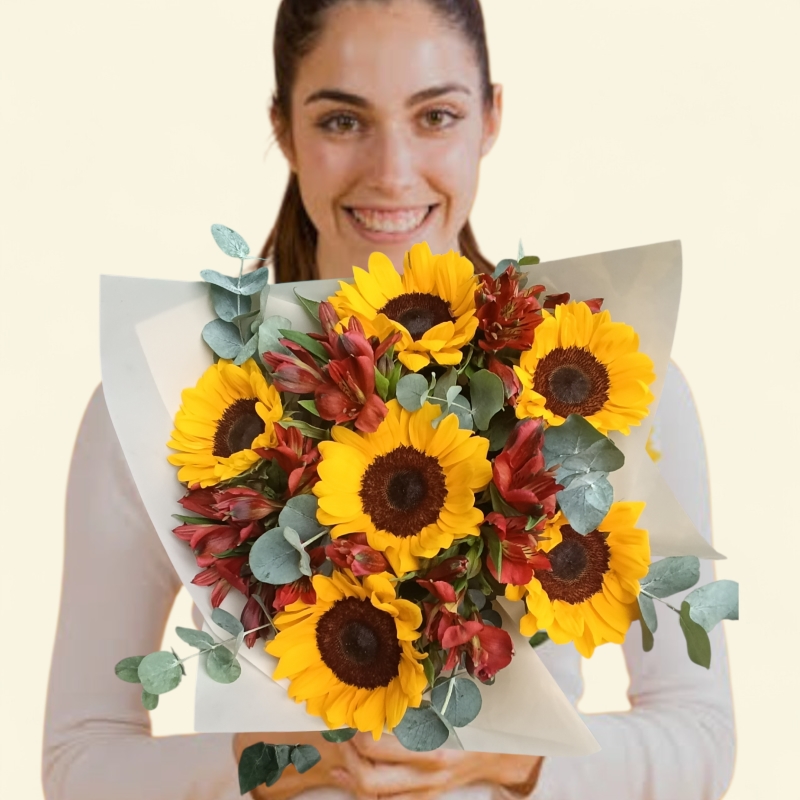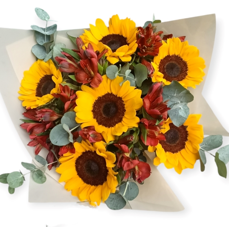 1 BUQUÊ 6 GIRASSOIS E 6 ASTROMÉLIAS COR TELHA