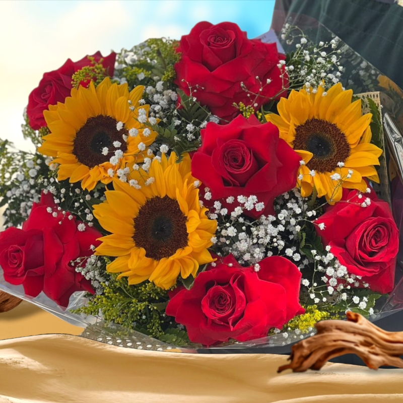 BUQUÊ 6 IMPORTADAS VERMELHAS (AB) E 3 GIRASSOIS