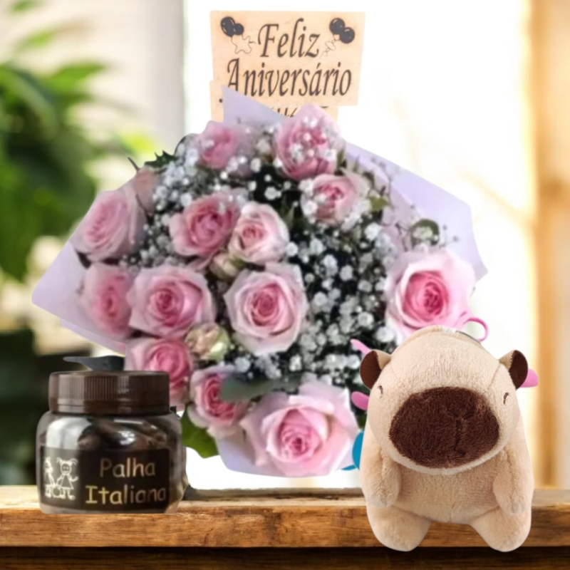 1 MINI BUQUÊ COM MINI ROSA( ROSA), PIK MSG, PALHA ITALIANA E MINI CAPIVARA