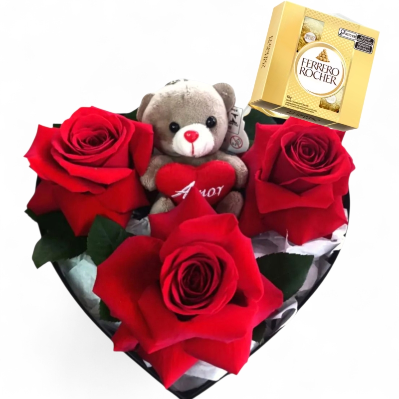 1 CARTONADA CORAÇÃO M COM 3 ROSAS (AB),MINI PELÚCIA AMOR E FERRERO COM 3