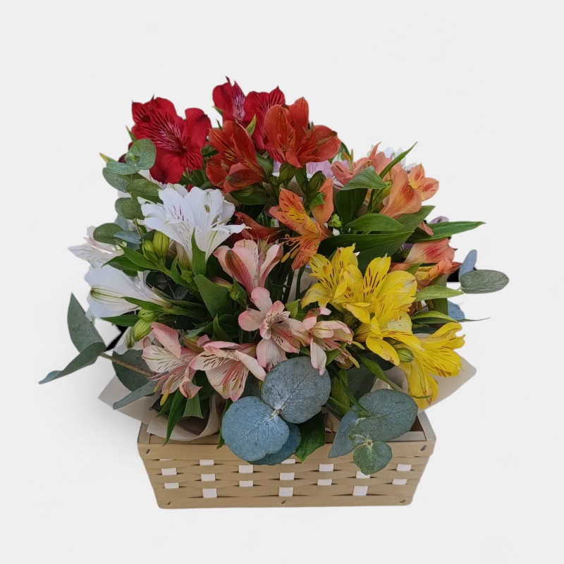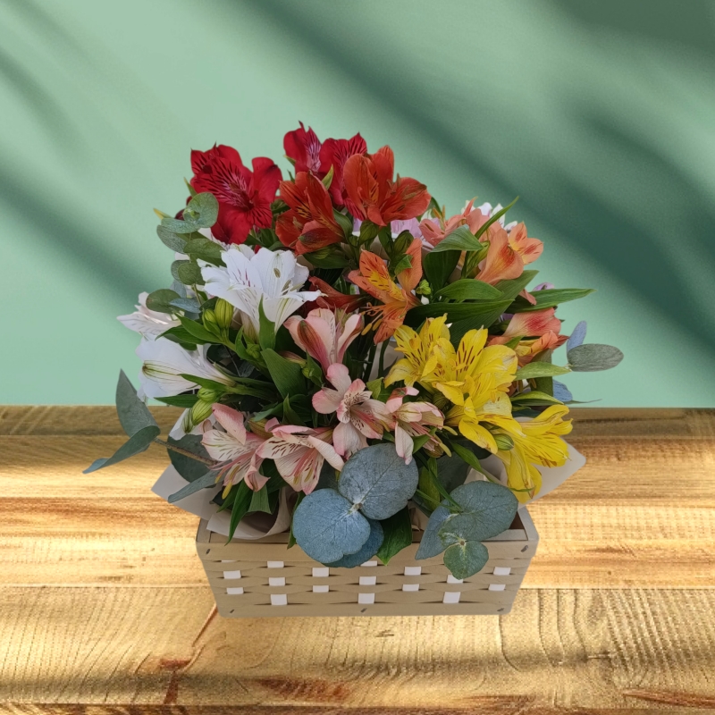 CESTA BOLSINHA COM 10 HASTER DE ASTROMÉLIAS COLORIDAS
