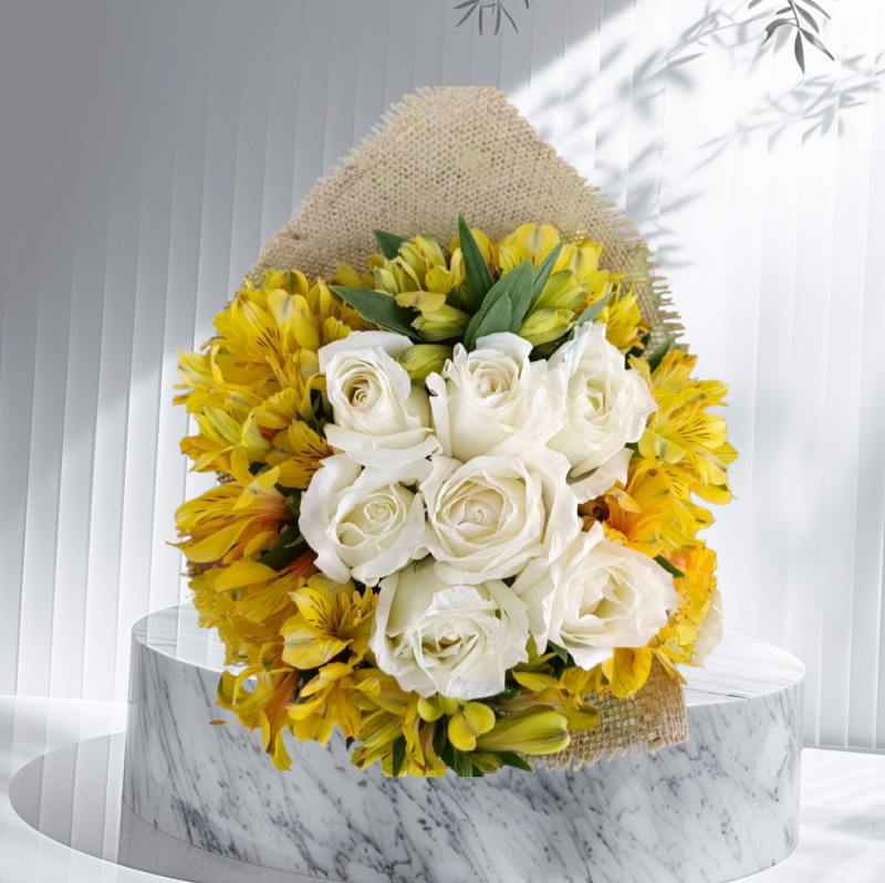 ESTOPINHA COM 7 ROSAS BRANCAS E 10 ASTER DE ASTRO AMARELA