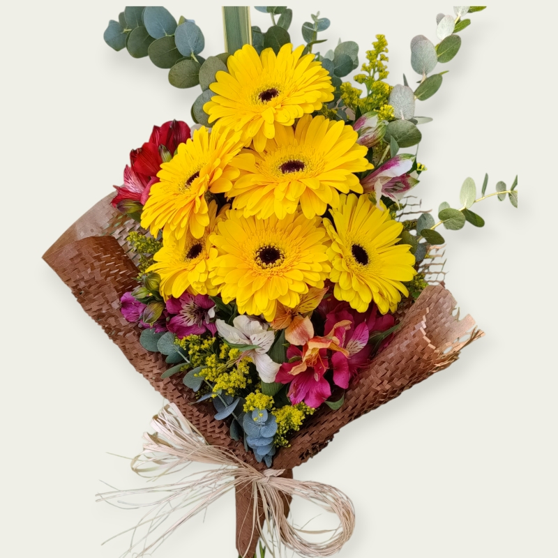 1 LEQUE COM 6 GERBERAS AMARELAS E 6 ASTROMÉLIAS COLORIDAS NO PAPEL