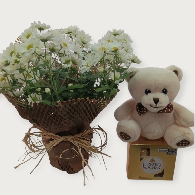 1 VASO DE MARGARIDINHA BRANCA, PELÚCIA MIMO E FERRERO COM 4 UNIDADES