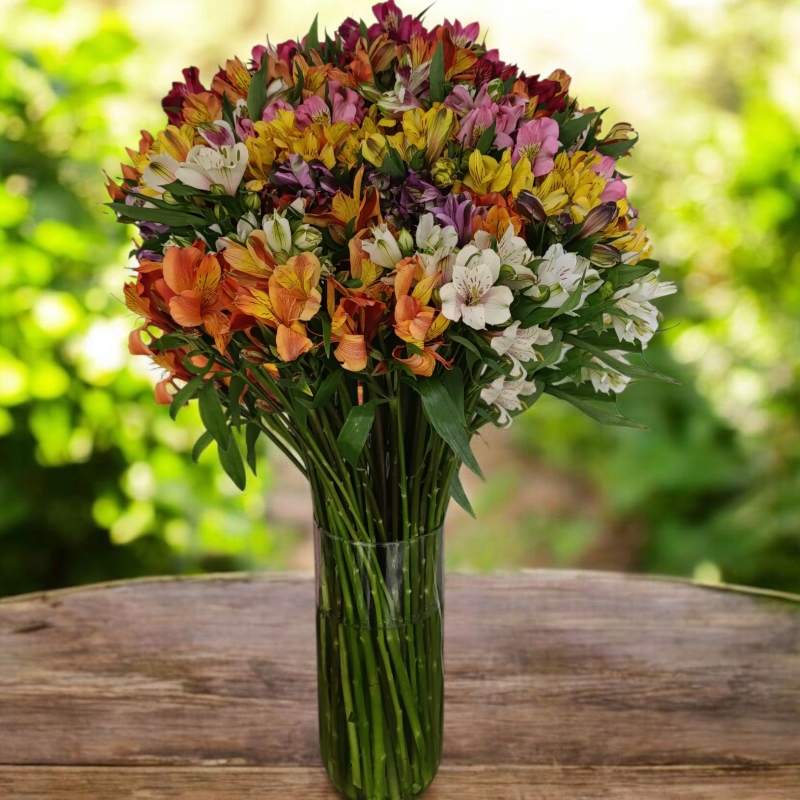 1 BUQUÊ COM VIDRO 30ALTU POR 13 DIAMETRO COM 70 ASTER DE ASTROMÉLIAS VARIADAS